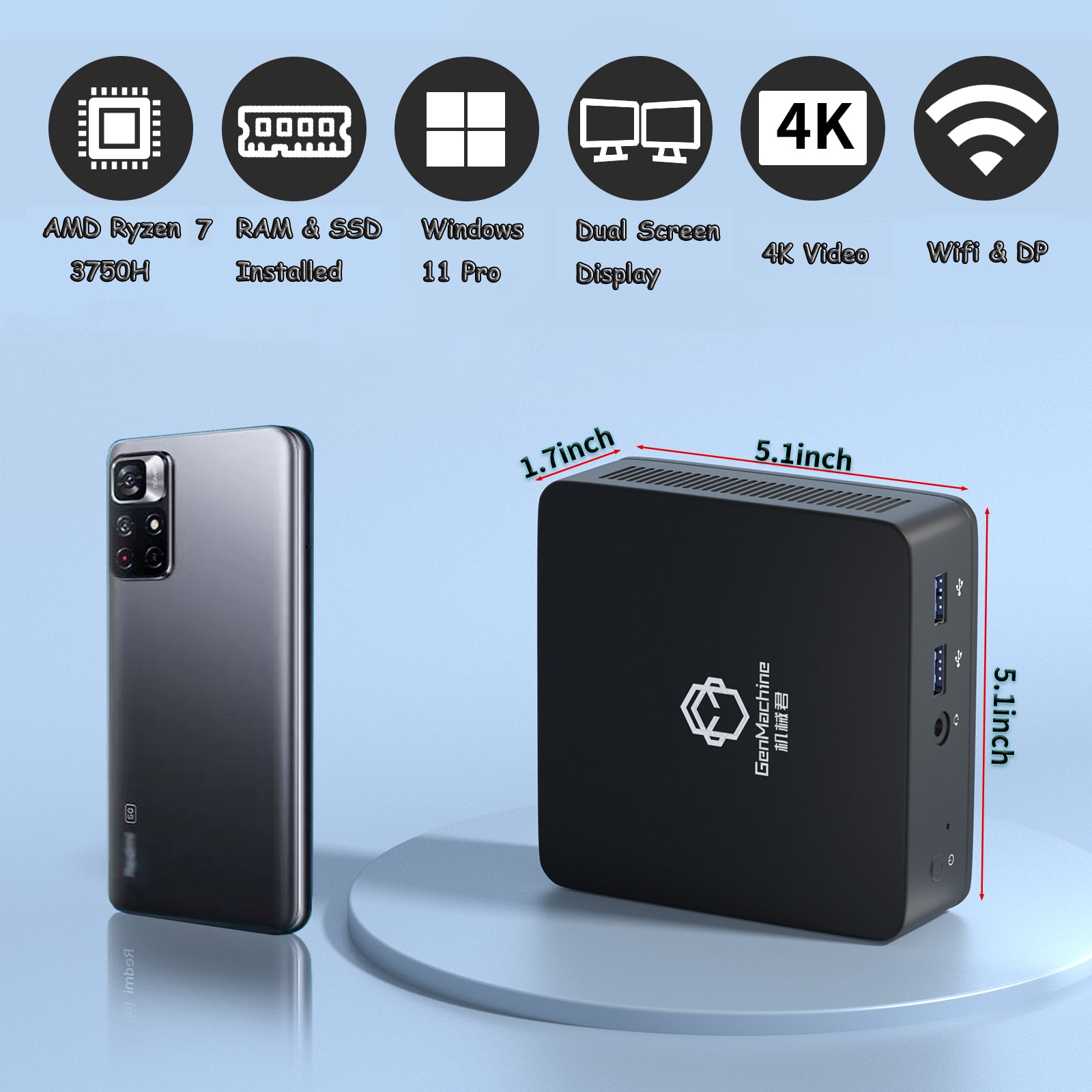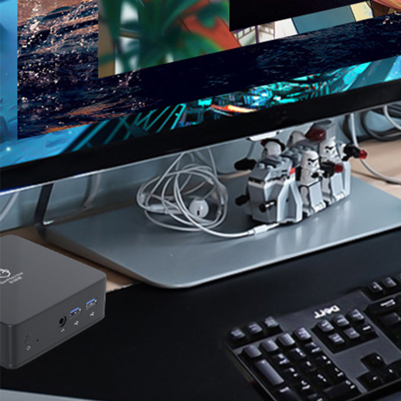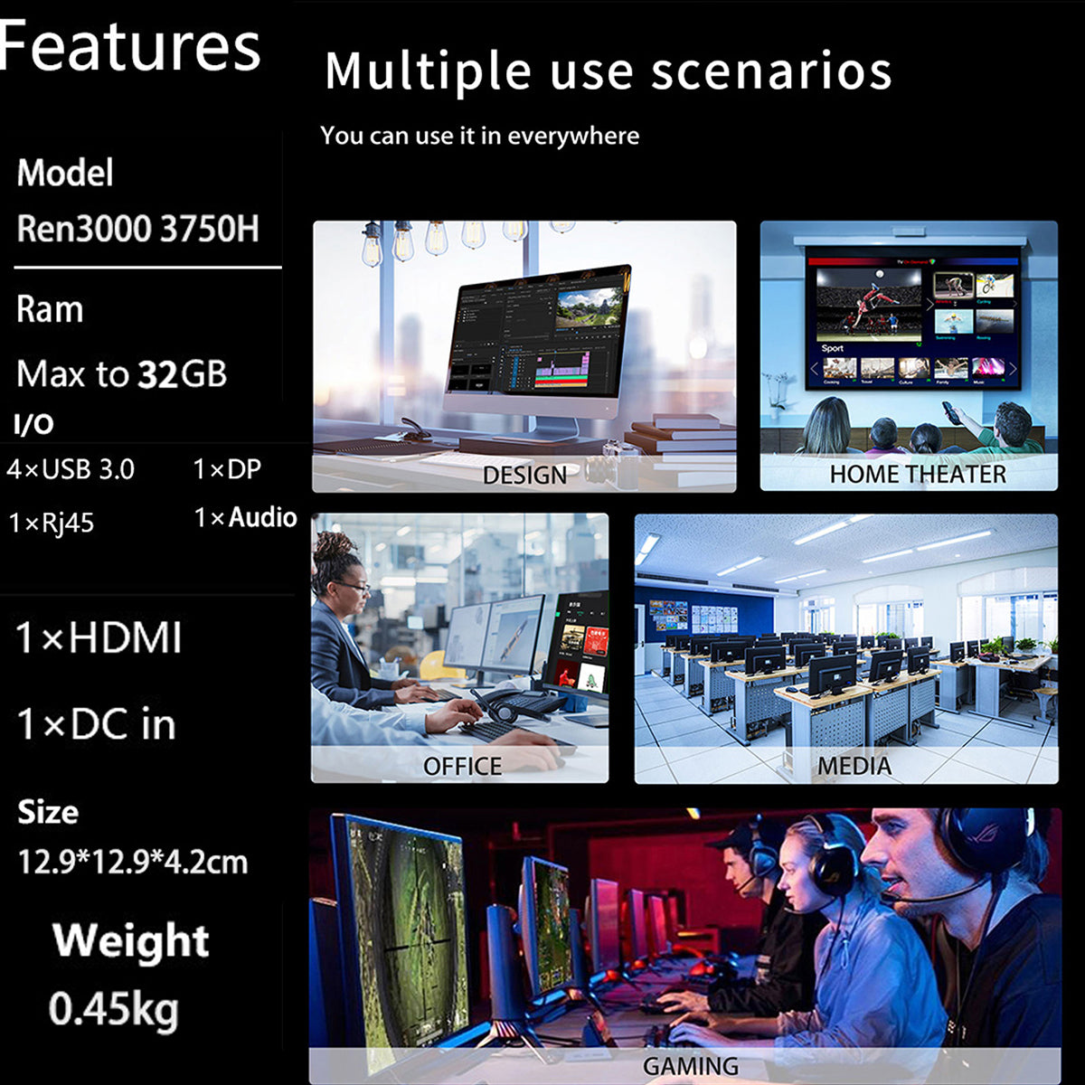The Ren3000 3750H mini desktop computer is equipped with an AMD Ryzen™ 7 3750H processor, which has 4 cores and 8 threads. It supports DDR4 memory and features WiFi and Bluetooth functionality. It uses an M.2 solid-state drive and is equipped with 4 USB 3.0 ports, 1 HDMI 2.0 port, and 1 DP 1.4 port. With its powerful performance, it meets both entertainment and work demands, providing an immersive experience. The Ren3000 3750H is not only lightweight and compact but also packed with powerful features, making it suitable for almost any usage scenario, whether it's for home, study, or office use. It offers high-performance processing and delivers ultra-high-definition screen output.