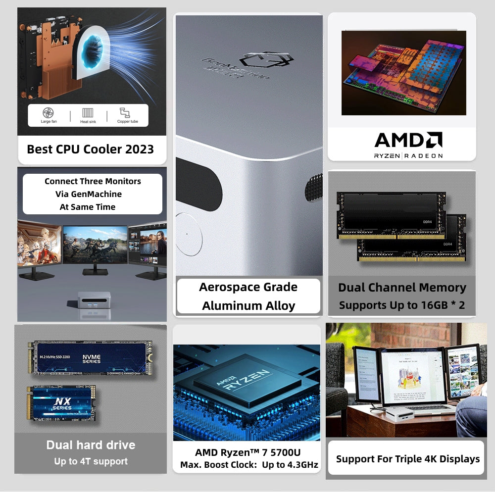 This mini desktop PC is equipped with an AMD Ryzen™ 7 5700U processor, boasting a powerful performance with 8 cores and 16 threads. It offers exceptional computing power and multitasking capabilities, making it suitable for high-performance computing and multitasking. Paired with high-speed DDR4 memory and reliable M.2 storage, it ensures fast data transfer and storage, providing a stable work environment. It supports Bluetooth 5.2 and WiFi 6 technology, enabling wireless connectivity and high-speed network transmission to meet professional users' requirements for network connections. Additionally, this desktop is equipped with multiple USB ports, making it convenient to connect various external devices, catering to professional users' needs for external devices. Moreover, with two HDMI ports, it can simultaneously connect multiple monitors, making it suitable for multi-screen work and professional graphics processing. In summary, this mini desktop is feature-rich and suitable for various professional fields' work and creative tasks.